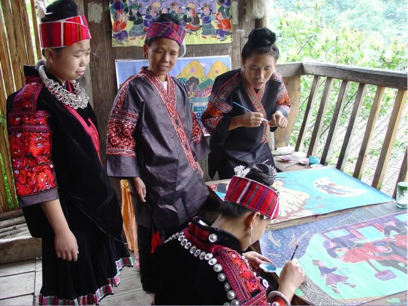 劍河現(xiàn)代民間繪畫(huà)源于傳統(tǒng)的苗族刺繡文化,是苗族刺繡文化的另一種表現(xiàn)形式和藝術(shù)升華。傳統(tǒng)的苗族文化多以服飾、歌舞為載體,并以刺繡及演唱等形式進(jìn)行表現(xiàn)和傳承。早期劍河現(xiàn)代民間畫(huà)即脫胎于具有適用性的苗族刺繡樣稿——剪紙和手繪刺繡粉本,換言之,手繪的苗族刺繡粉本便是劍河現(xiàn)代民間繪畫(huà)的雛形,劍河第一批優(yōu)秀的現(xiàn)代民間畫(huà)作者,即是原當(dāng)?shù)厥掷L粉本的能工巧匠。劍河現(xiàn)代民間繪畫(huà)多以苗族神話傳說(shuō)中的故事情節(jié)和民俗節(jié)日、生產(chǎn)活動(dòng)等內(nèi)容為題材入畫(huà),素材涵蓋自然界花鳥(niǎo)蟲(chóng)魚(yú)及人物、家畜等具體形象,造型稚拙天真,設(shè)色濃艷,對(duì)比強(qiáng)烈。作品傳達(dá)出典型的地域民俗氣息及濃厚的鄉(xiāng)土味,便是其標(biāo)志性特征。