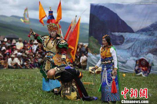 圖為掛牌儀式現(xiàn)場上演藏戲《格薩爾王傳》 鐘欣 攝