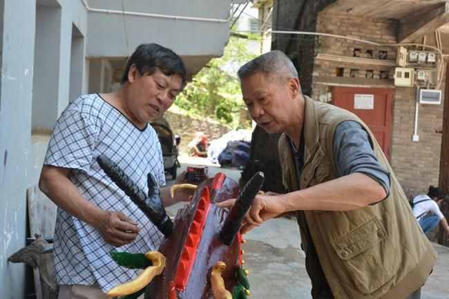 家住鎮(zhèn)遠(yuǎn)縣?陽鎮(zhèn)東關(guān)社區(qū)的皇安東,今年68歲,雖然年近古稀,但精氣神堪比五十來歲的中年人,皇安東介紹由于個人愛好,8歲時與龍舟接下了深厚的情緣,對“龍”文化研究的執(zhí)著像一如往日對戀愛的投入充滿激情和憧憬一樣,經(jīng)過60多年的龍舟文化研究探索,他手工雕刻的龍頭威武靈動融匯鎮(zhèn)遠(yuǎn)傳統(tǒng)文化精髓,“鎮(zhèn)遠(yuǎn)賽龍舟”已被列為國家非物質(zhì)文化遺產(chǎn)項目名錄?;拾矕|49歲開始自學(xué)雕刻龍頭,鎮(zhèn)遠(yuǎn)端午節(jié)每年祭祀用的龍頭幾乎出自他手,雕刻的龍頭已上數(shù)百頭。當(dāng)筆者提到皇安東為何歷經(jīng)六十多年對雕龍頭的“手藝”癡心不改時,他笑著爽朗地說:“我一生雕龍頭,主要的精神動力是對鎮(zhèn)遠(yuǎn)傳統(tǒng)龍舟文化的熱愛和傳承。”皇安東一家人整天在“龍”的藝術(shù)空間里過得有滋有味。