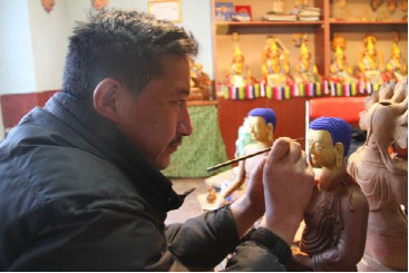 在普布次仁所在的公司里,有一個專門用來制作泥塑面具的房子,從外表上看去,它只是一個普普通通的藏式民居,但走進其中,則別有一番天地。在房間里整齊擺放了大大小小的泥塑面具、佛像,這些手工藝品造型生動,每一件手工藝品仿佛都在訴說著一個古老、動人的故事。