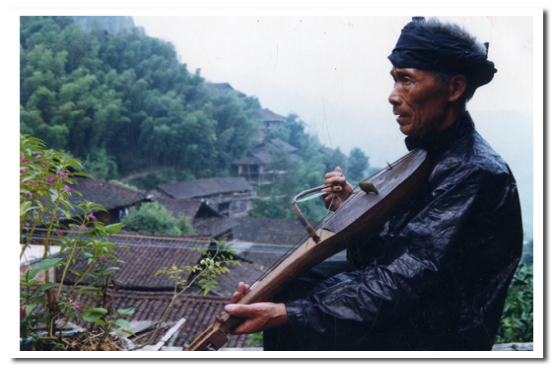 果哈是苗族唯一的古老的民間弓弦樂器,因其形似瓢,故苗語稱之為果哈(意即瓢琴),是唱古歌時不可缺少的伴奏樂器,一般以歌師自拉自唱為主。制作工藝比較粗糙,先選一段長60厘米、直徑為15厘米左右的鴨腳木或泡桐木制成琴身,在其二分之一的一端剜成瓢狀,封住薄板作共鳴箱。另一端修成琴柄,在琴柄頂端鉆孔安琴鈕,用棕繩、牛筋作琴弦,用竹片和綜絲制成弓。琴置兩弦,演奏時以人的唾液代替松香,演奏者時而將弓毛放入口中,讓弓毛增加溫度,增強(qiáng)與琴弦的磨擦,使之發(fā)音。果哈音量微弱,發(fā)音低沉,但音色獨特,與苗歌語調(diào)相當(dāng)協(xié)調(diào),較適合表現(xiàn)安靜、深沉情緒,故常為苗族敘事古歌伴奏。