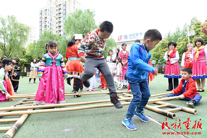 每次活動日,學(xué)校都會從民族傳統(tǒng)游戲中梳理出十多個符合幼兒年齡特點(diǎn)、有助于幼兒身心發(fā)展的游戲內(nèi)容,因地制宜轉(zhuǎn)化成有趣的幼兒民間運(yùn)動游戲。在游戲中,既讓孩子們體驗(yàn)了運(yùn)動樂趣,又傳播了民族知識。這些富有童趣的游戲,深受孩子們喜愛。
