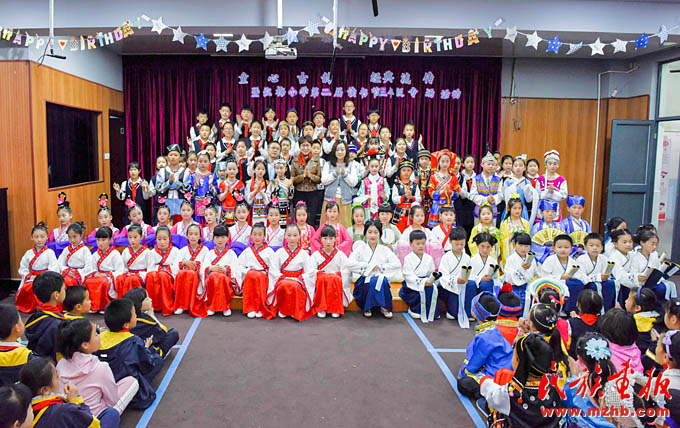 同一天下午,一場精彩的T臺秀在上海市閔行區(qū)梅隴鎮(zhèn)弘梅小學(xué)上演。小學(xué)生們身著民族服裝亮相,動感的音樂、精彩的表演,將“民族團(tuán)結(jié)一家親”的理念演繹得生動活潑。學(xué)校布置的民族文化墻上,展示了我國56個民族的風(fēng)土人情,營造了多姿多彩的民族文化氛圍,讓民族特色文化陪伴在學(xué)生身邊。