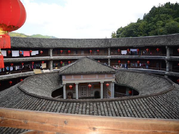 一座土樓就是一個藝術(shù)殿堂。每一座土樓,又如同一個“大家族,小社會”。土樓內(nèi),居住在同一屋頂下的幾十戶幾百人同祖同宗同血緣同家族,過著共門戶、共廳堂、共樓梯、共庭院、共水井的和睦生活。這種聚族同樓而居的生活模式,典型地反映了客家人的傳統(tǒng)家族倫理和家族的親和力。而且,樓內(nèi)的客家人,住著層數(shù)相同、開間面積相等、無明顯朝向差別、更無貴賤等級之分的均等居室。平等聚居,反映了客家人融洽和睦的家風和平等團結(jié)的傳統(tǒng)。