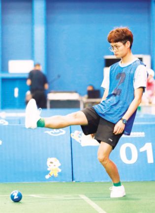 江西隊選手在混合雙蹴比賽中起腳擊球 何五昌攝