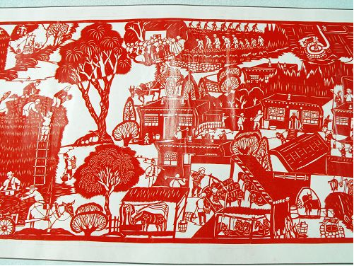 2、達拉特紀事剪紙的歷史價值很高,《農(nóng)民紀事圖》上卷記載了從建國到現(xiàn)在農(nóng)村的發(fā)展變化,在作品中我們看到了很多瀕臨失傳的農(nóng)村生產(chǎn)生活工具和生產(chǎn)方法,也能看到黨和國家在每一年出臺的各項惠農(nóng)利民政策,對于研究歷史具有重大的文獻價值。