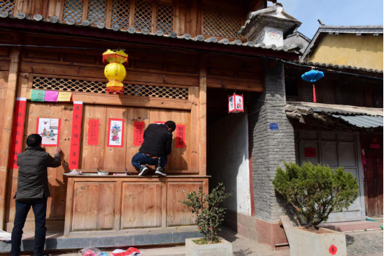 寫春聯(lián)繪年畫的傳統(tǒng)在劍川縣金華鎮(zhèn)由來已久,明朝洪武年間改土歸流和移民屯邊制度的推行,使儒家文化、理學(xué)思想逐漸融入邊疆人民的生活。金華古鎮(zhèn)居民受此影響,走上追求仕途功名的道路,文人鄉(xiāng)紳都以顯示儒學(xué)身份為榮。每逢春節(jié),人們會邀請有功名的仕子或傳學(xué)明經(jīng)的文人來到家中,撰寫對聯(lián),同時根據(jù)時令畫上一兩幅門神畫,希望通過此舉祈愿自家后生求得功名。如今走在金華古鎮(zhèn)西門街上,仍能看到家家種花養(yǎng)草,戶戶楹聯(lián)盈門,一派文風(fēng)蔚然的生機。
