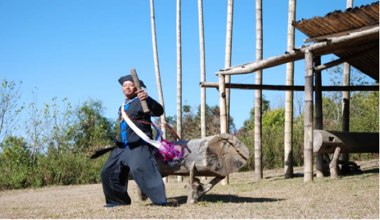 巖相太跳木鼓舞主要有握拳、跺腳、抬腿、提襟等表演動(dòng)作,用木鼓鼓槌敲打木鼓,敲打木鼓同時(shí)領(lǐng)唱與眾人踏節(jié)而歌為伴奏,歌詞多以述說(shuō)民族歷史、祭祀和勞動(dòng)生產(chǎn)、生活等方面為內(nèi)容。舞蹈中又加入了佤族女子的“甩發(fā)”動(dòng)作,使《木鼓舞》在形式和舞蹈語(yǔ)匯方面得到了進(jìn)一步的豐富,在傳統(tǒng)表演的基礎(chǔ)上融入現(xiàn)代木鼓文化的理念,用肢體語(yǔ)言完整的表達(dá)木鼓的意境。