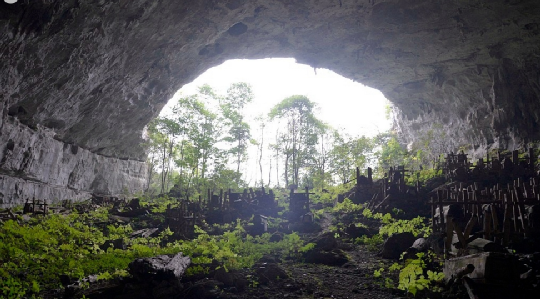 果里巖洞葬位于貴州龍里縣擺省鄉(xiāng)果里村東1公里煤洞坡的洞穴中,地處巖溶山原,峰叢林立,喬灌間雜。該洞在山頂下四十米處呈南北向橫穿山體,長580米,寬為38—65米,高為21—50米,有兩個入口;北面入口,寬54米,高21米,;南面入口,寬35米,高45米,有三道石砌墻垣。洞中地勢內(nèi)斜平緩,洞內(nèi)干燥,能見度好,入口處地勢外斜。據(jù)查,果里的苗族于明朝初期從貴陽遷徙而來。從遷徙之初至清末,他們均習(xí)慣將亡者殮于棺木集中存放在洞穴之內(nèi)。在洞穴北面入口3000平方米的范圍內(nèi)現(xiàn)存完好的棺木有192具,腐朽散落及其它原因損毀的約200余具。棺木材質(zhì)為杉木。棺木有平板平頭和鼓型雄頭之分,其大小因亡者的體型而定。平板平頭型棺木制作粗糙,長1.45—2.23米,寬0.46—0.75米,高0.46——0.9米;鼓型雄頭棺木多為杉木本色,長1.5—2.23米,寬0.48—0.8米,高0.5—0.9米。棺木一律頭向北面入口,均固定于兩個或三個“井”字架上;三個“井”字架表明亡者為男性,兩個“井”字架的為女性。棺內(nèi)亡者頭靠凹型木枕。平板平頭棺為明代,鼓型雄頭棺為清代。