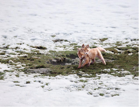 藍(lán)天白云,微風(fēng)輕漾;草地碧綠,鳥語花香。大自然的美景圖正在小赤狐的家園四周徐徐展開。在膽大的小赤狐的叫喚聲里,躲在洞內(nèi)的另外兩只小赤狐也壯著膽子探出頭來。不一會(huì)兒,它們習(xí)慣了周圍的環(huán)境,三只小赤狐在離洞口5米遠(yuǎn)的范圍內(nèi)嬉戲玩耍著。它們時(shí)而跳躍,時(shí)而奔跑,展現(xiàn)出本能的捕獵動(dòng)作。稍大一點(diǎn)的小赤狐騎在小一點(diǎn)赤狐的背上嬉戲玩耍,小赤狐也不示弱,奮力反擊,猶如兒童打鬧,其樂無窮。那烏黑溜圓的眼睛彎了又彎,毛茸茸的尾巴高高地翹起,身體嬌小,惹人喜愛,讓人看了會(huì)產(chǎn)生想上去抱一抱、摸一摸小赤狐身軀的念頭。