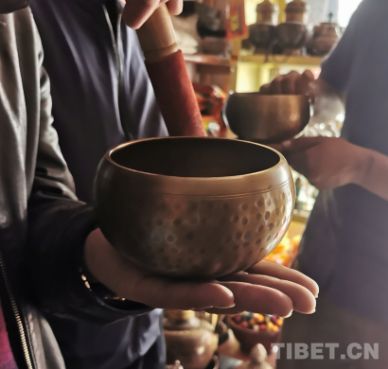 一位店主告訴我,sing bowl在印度和尼泊爾都有,但印度的一般稍大些,尼泊爾的稍小些。我仔細對比了店中的兩種碗,確實如此。同時,有些碗內部有紋飾,外部也有相應簡易圖形的點綴,比如圓形斑點,但有些碗的內壁和外壁無任何紋飾。一般有紋飾的價格要稍高一些,價格從200元至350元不等。但分辨sing bowl質量最重要的是看其“唱歌”的音質與在手上產(chǎn)生震動的幅度,一般以音質低沉雄厚為佳,以震動引發(fā)全身共鳴的程度高為好。但我們的現(xiàn)場演示表明,個人使用的技巧也很重要。