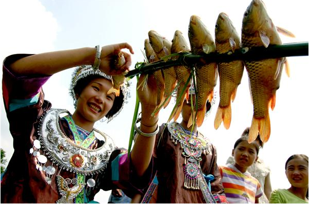 燒魚(yú)是廣西融水苗胞的習(xí)俗之一,融水的苗族同胞素有在稻田里養(yǎng)魚(yú)的習(xí)慣,每年春插,苗家人向來(lái)喜歡在稻田里放養(yǎng)鯉魚(yú)。每年的秋收稻黃時(shí)節(jié)也是田鯉肥壯之時(shí),這時(shí)來(lái)自四鄉(xiāng)八寨眾多的各民族兄弟便匯聚起來(lái),點(diǎn)燃一堆堆篝火,燒田鯉吃野餐,盡享豐收喜悅。燒魚(yú)從9月稻黃收割開(kāi)始持續(xù)到12月底才正式結(jié)束,故名“元寶山金秋燒魚(yú)季”。燒魚(yú)季節(jié),苗寨家家戶(hù)戶(hù)釀起醇濃的甜酒,蒸著香噴噴的糯米飯,帶上食鹽、辣椒、蒜苗、蔥花、薄荷等佐料上山去剪禾。晌午時(shí)候,他們?cè)谔镱^或田邊的平地?zé)鹨欢讯洋艋?,從田里抓?lái)一籠籠活蹦亂跳的鯉魚(yú),用樹(shù)枝或竹片把魚(yú)一條條串起,排成一排,然后放在紅彤彤的火炭上翻來(lái)覆去地烤,大約半小時(shí)左右,魚(yú)被烤炙得“呲呲”作響,水分烤干,慢慢地變黃,直至熟透,香飄四溢,遠(yuǎn)遠(yuǎn)就可聞到香味。