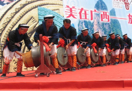 銅鼓舞,在廣西都安、巴馬、東蘭、馬山一帶的瑤族地區(qū)盛行。每年農(nóng)歷五月二十九過(guò)“祝著節(jié)”(年節(jié)),要敲12天銅鼓,表示懷念祖宗和預(yù)祝豐收。節(jié)日隆重,聚眾數(shù)以千記。跳舞時(shí),用銅鼓一對(duì),其意一雌一雄,公聲小,母聲大。由兩男敲擊,兩男持雨帽回環(huán)擊鼓者扇搖,還有兩男兩女,應(yīng)鼓樂(lè)節(jié)奏翩翩起舞,舞姿雄健優(yōu)美,氣氛熱烈,十分感人。