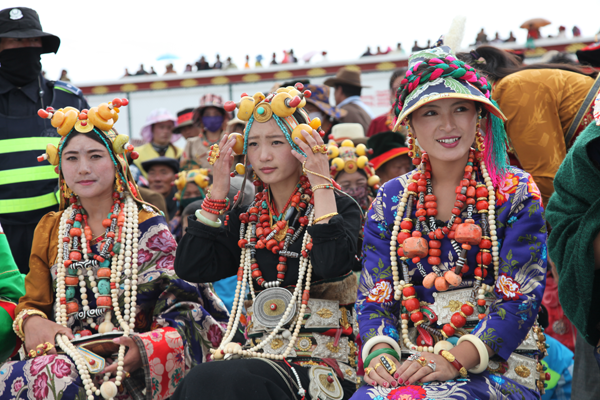 甘、青、川的藏族男子非常講究腰飾,有財(cái)力的男子一般都有一條鑲有僅、銀、玉的寬皮腰帶,腰帶上還掛有裝飾性的小刀、火鐮等。青海玉樹(shù)地區(qū)的婦女裝追求華麗,內(nèi)衣外袍色彩艷麗,綢緞腰帶留長(zhǎng)飄帶,頭、頸、發(fā)、腕、指和腰佩有金、銀、玉、珊瑚、瑪瑙等珍貴飾品,一套豪華女裝價(jià)格不菲。因此有諺語(yǔ):“男人的財(cái)富系在腰上,女人的嫁妝穿在身上”之說(shuō)。云南藏區(qū)的女裝上身穿長(zhǎng)袖彩綢衫,外著無(wú)袖大襟長(zhǎng)袍,長(zhǎng)袍領(lǐng)口、襟邊和下擺鑲有錦緞,色彩艷麗。云南一些藏區(qū)的女子喜歡穿百褶裙,顯示出女性的優(yōu)美身材。西藏工布地區(qū)的女裝顯得簡(jiǎn)約,先穿有袖內(nèi)衣,再將氆氌拚縫成大片,中間挖一圓口,穿時(shí)將頭伸進(jìn)圓口兩端垂與胸背,再束腰帶即可。藏族婦女的頭飾也很多,有碎辮的、有戴頭巾的,有盤(pán)發(fā)的,西藏山南地區(qū)的巴珠最有特點(diǎn)。巴珠是三枝狀,平系于頭頂兩枝向前,將分梳的兩條發(fā)辮分別盤(pán)于兩枝上。其上部還有一弓形物,與三枝狀兩端連接,上系絲織品,邊緣鑲珍珠、珊瑚等。女子13歲戴巴珠,象征已經(jīng)成人。金邊帽也很有特色,藏區(qū)的男女都戴。帽型為桶狀,周邊鑲織錦,內(nèi)有四片耳片,兩大兩小,天冷時(shí)放下耳片護(hù)耳。狐皮帽形似倒掛的金鐘花,以布作底層,再縫上狐貍皮,帽后有兩條長(zhǎng)飄帶。男帽稍高,女帽較低。