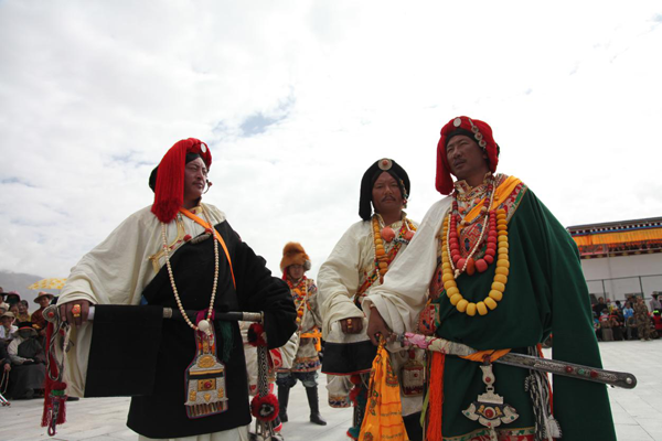 藏族分布在全國(guó)五省區(qū),因氣候、環(huán)境的不同,形成了豐富多彩的服飾文化。藏族服飾有“隔山兩個(gè)樣的”說(shuō)法,有人統(tǒng)計(jì),因地域、男女、年齡、婚否和季節(jié)的不同,藏族服飾有100多種。男裝各地大同小異,上身穿寬大的藏袍,袖長(zhǎng)及膝。束各種腰帶。寬大的藏袍非常適應(yīng)青藏高原多變的氣候,露出右臂便于勞作,天熱時(shí)將脫掉兩袖,將藏袍扎在腰間,天冷時(shí)套上雙袖。西藏人的服飾樣式很多,有衛(wèi)藏類服飾、康巴類服飾、安多類服飾和拉薩裝。衛(wèi)藏主要指除昌都地區(qū)以外的西藏大部分地區(qū)。西藏大部分地區(qū)的男裝,主要衣料是氆氌,城鎮(zhèn)人多穿黑色,農(nóng)牧民多穿白色。康巴主要指西藏的昌都和青海的玉樹(shù)、果洛一帶。男子多內(nèi)穿右襟齊臍短襖,外罩圓領(lǐng)寬袖長(zhǎng)袍。頭戴狐皮帽或“扎秀”(發(fā)辮纏紅絲線),扎腳穿高筒靴顯得英俊瀟灑。女子穿長(zhǎng)袖衫,外罩坎肩,腰束彩條圍裙。講究腰帶和腰刀,腰帶和腰刀上要鑲嵌金銀珠寶。女子多戴名貴飾品,顯得華麗昂貴。安多藏區(qū)主要指西藏那曲與安多縣接壤的地方。過(guò)去,男裝衣領(lǐng)、袖口,下擺多飾虎豹皮,女裝邊飾多為水獺皮,而且項(xiàng)、腕、手指和腰間配有金銀寶石飾物。