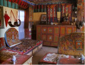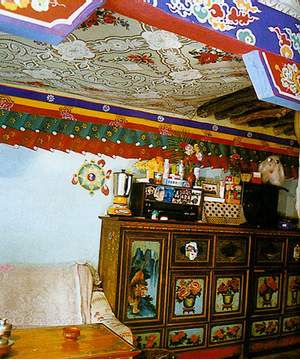 藏族民居室內(nèi)裝飾講究工整、華麗、亮堂,上至天花板下至與地板相接的墻角都采用雕刻、彩繪等藝術(shù)手段加以裝點(diǎn),尤其是橫梁、柱頭和大門等木結(jié)構(gòu)空間是充分展示裝飾才能的地方,在這里裝飾效果盡其所能。此外寺廟重點(diǎn)佛堂,回廊墻壁上繪制彩畫,這也是一種重要的裝飾手段,而百姓居室內(nèi)的墻壁上用繪制花卉、彩條來(lái)取得裝飾效果。