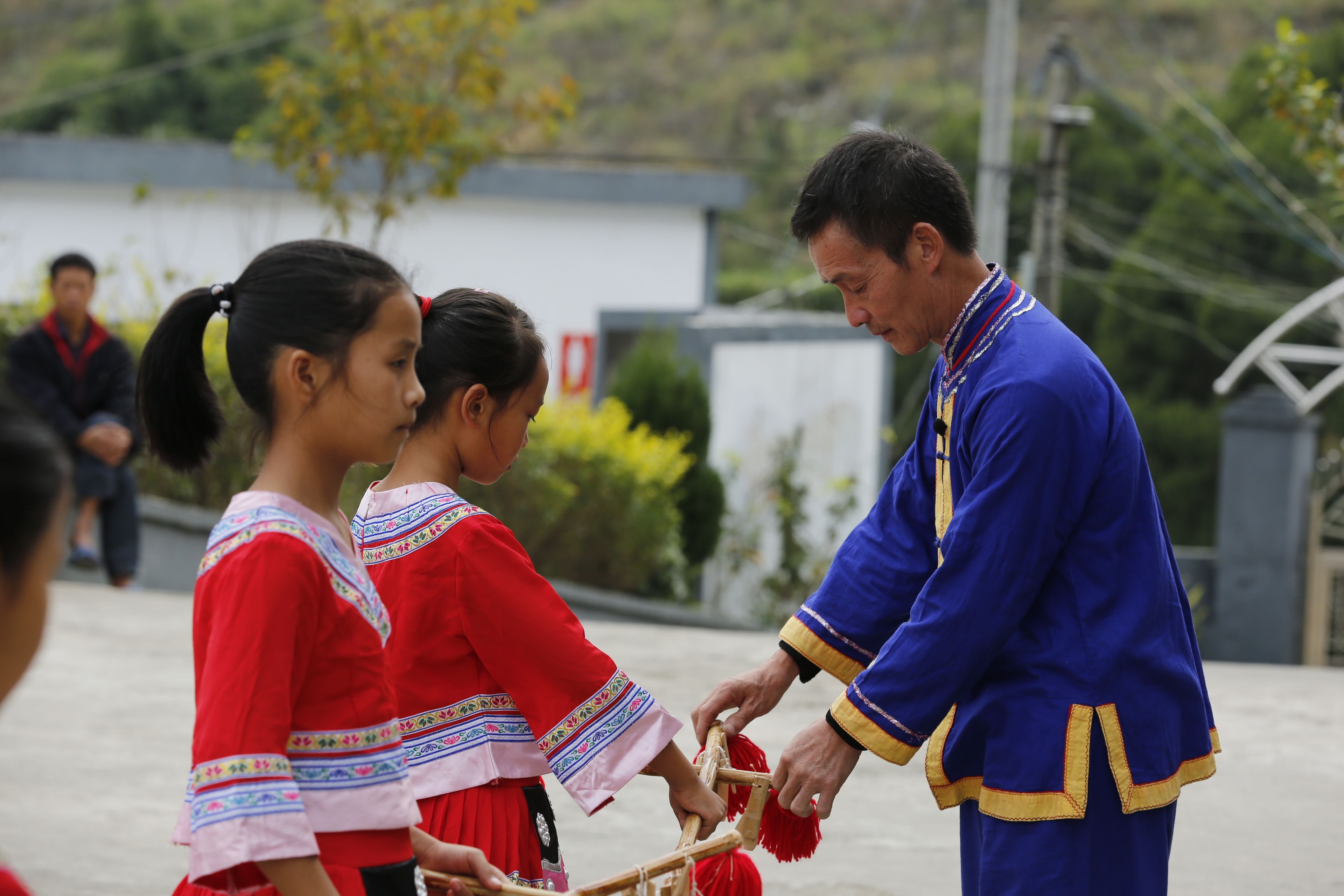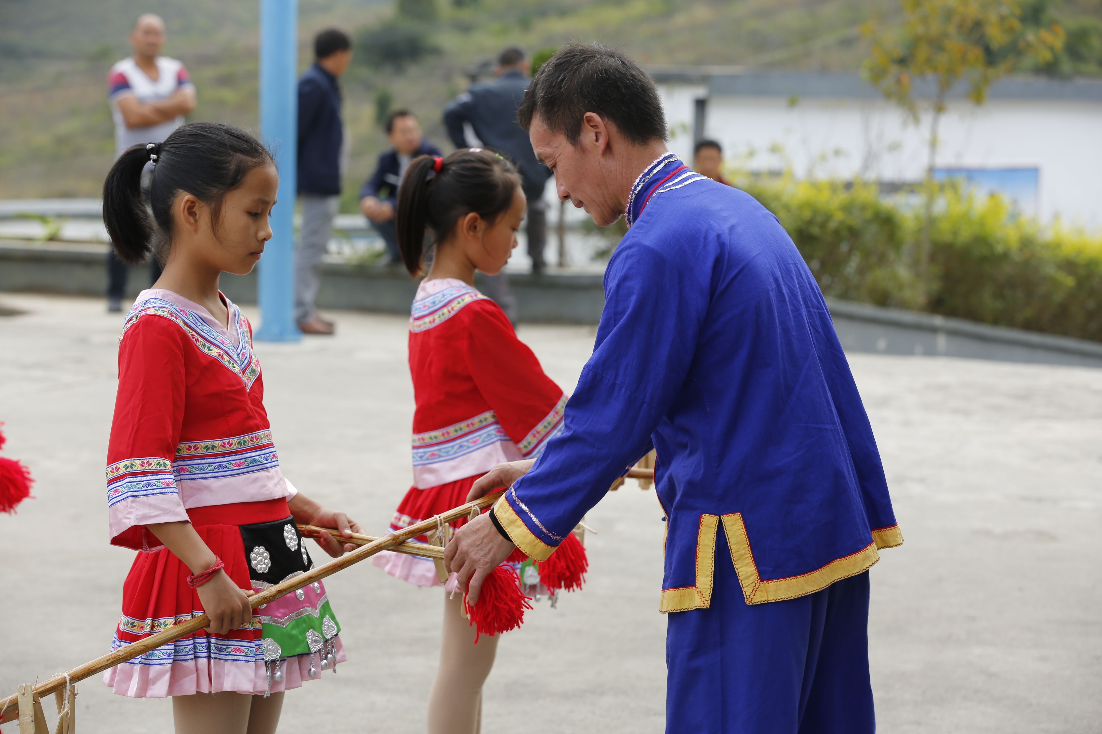 圖片說(shuō)明:貴州貴陽(yáng)苗族長(zhǎng)竹舞傳承人教孩子們持竿手法