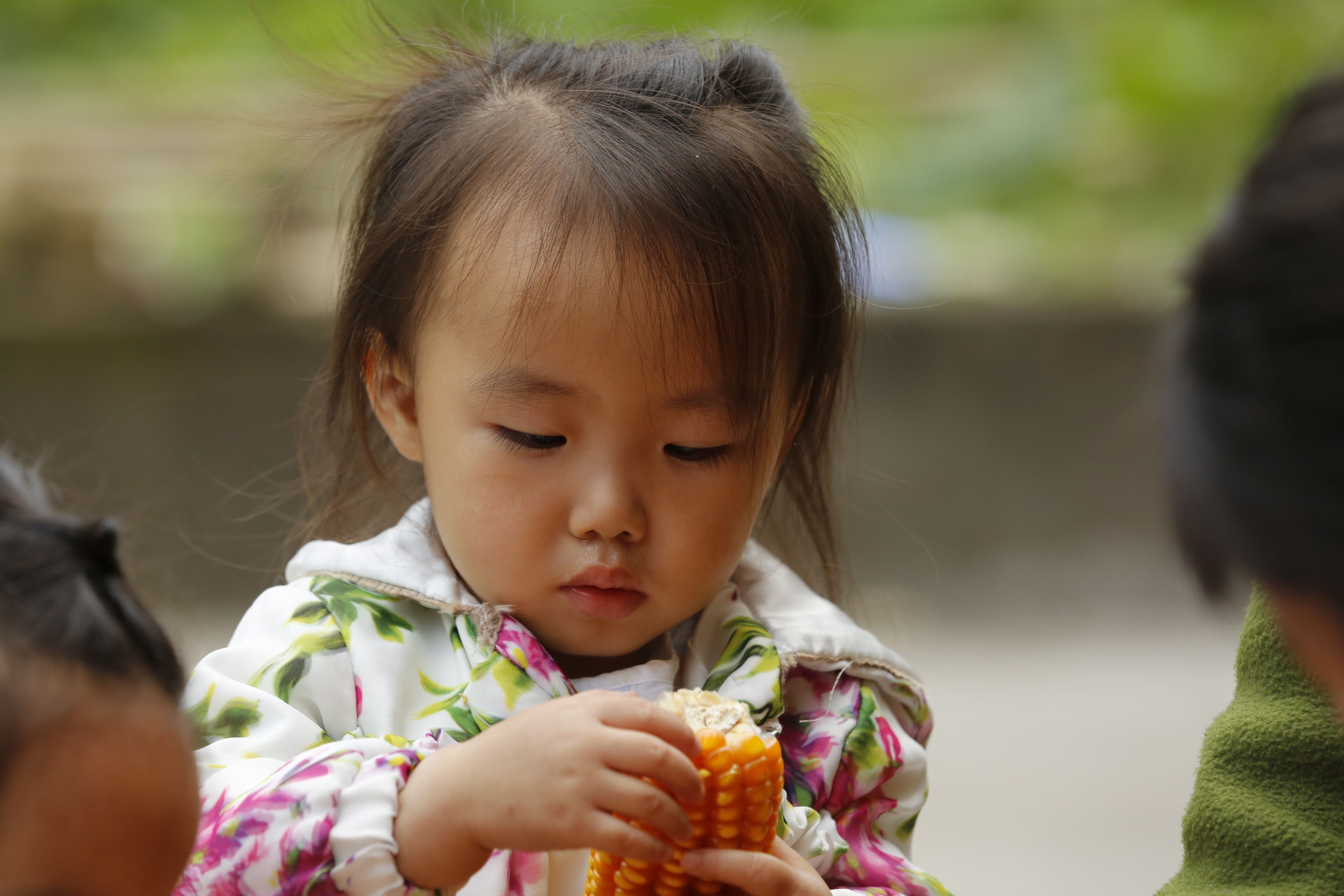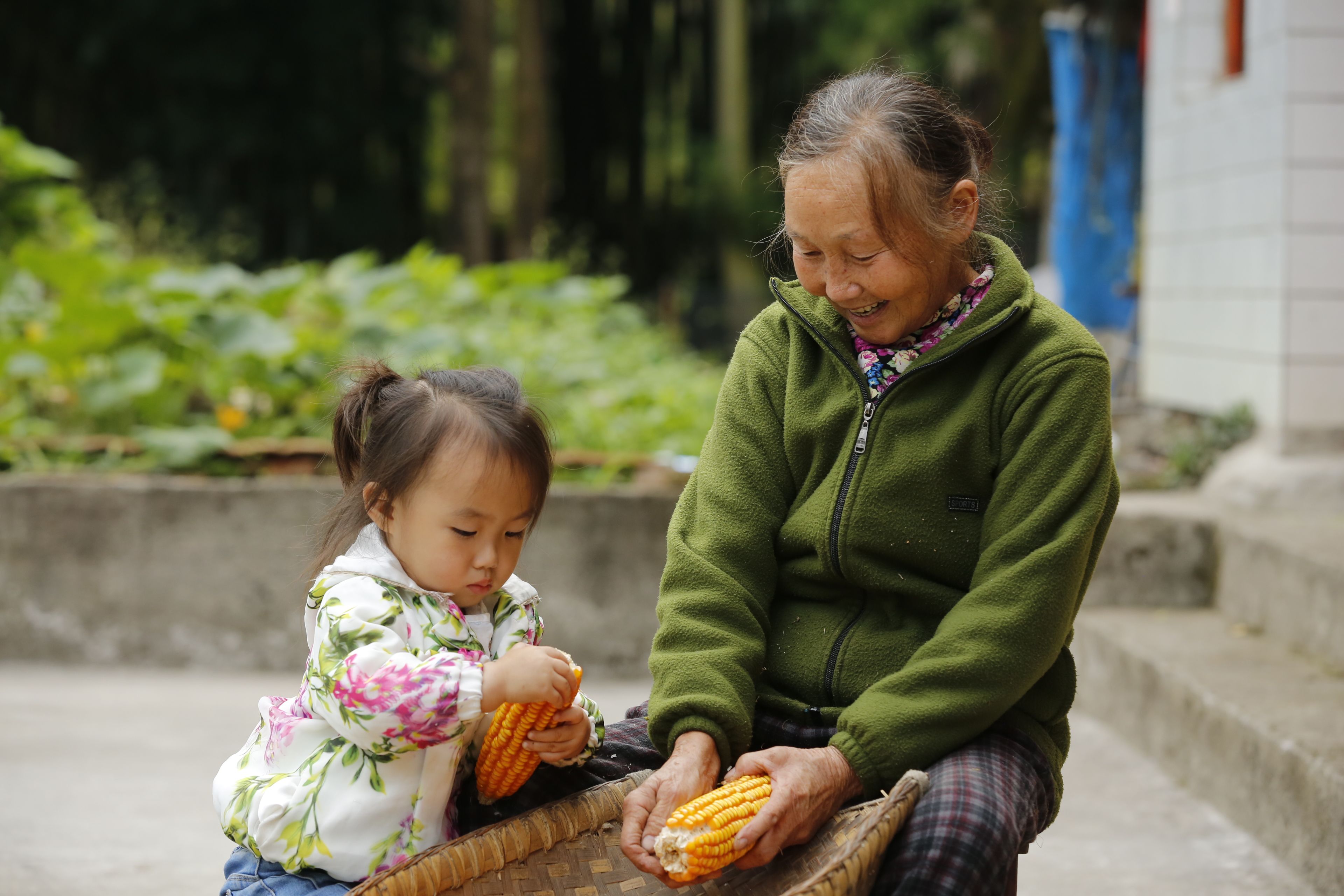 貴州貴陽苗族日常生活-老年人與兒童剝玉米